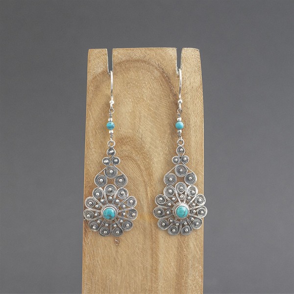 Efektowne długie kolczyki od podstaw wykonane zostały ręcznie ze srebra próby 925 oraz kamieni turkusu. Wielkość kamieni 5 mm i 3 mm. Wielkość ozdobnych tarcz kolczyka 36x22 mm. Długość całkowita kolczyków 6,9 cm.