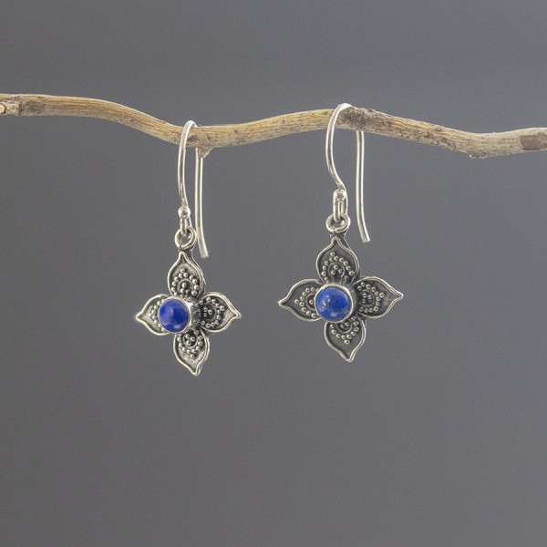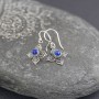 Kolczyki od podstaw wykonane zostały ręcznie ze srebra próby 925 z oprawionymi kamieniami lapisu lazuli. Wielkość kamienia 4 mm. Wielkość tarczy kolczyka 14 mm. Długość całkowita kolczyków 3 cm. Całość zdobień wykonana została ręcznie pracochłonną techniką granulacji. Kolczyki stworzone z myślą o Paniach lubiących drobną biżuterię.