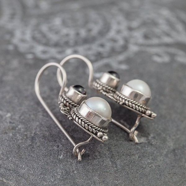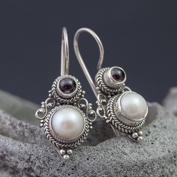 Perła (7 mm) i granat (4 mm) ubrane w pięknie zdobione srebro próby 925. Długość całkowita kolczyków 3,1 cm. Całość zdobień wykonana została ręcznie pracochłonną techniką granulacji.
