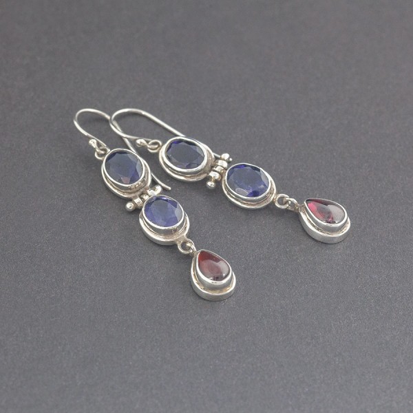 Eleganckie kolczyki od podstaw wykonane zostały ręcznie ze srebra próby 925 z oprawionymi kamieniami iolitu (7x9 mm) i granatu (6x9 mm). Długość całkowita kolczyków 5,8 cm.