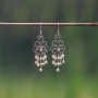 Kolczyki w stylu orientalnym od podstaw wykonane zostały ręcznie ze srebra próby 925 oraz perełek wielkości 4 mm. Wielkość ozdobnej tarczy kolczyka 28x22 mm. Długość całkowita kolczyków 7 cm.