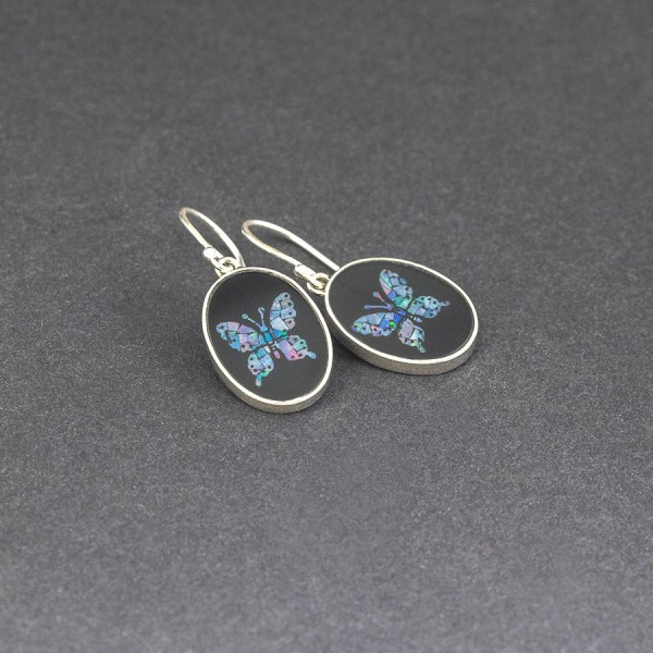 Mozaika ułożona z opalu australijskiego w kształt motyla i zatopiona w żywicy. Całość oprawiona w srebro próby 925. Kolczyki od podstaw wykonane zostały ręcznie. Wielkość tarczy kolczyka 14x18 mm. Długość całkowita kolczyków 3,5 cm.