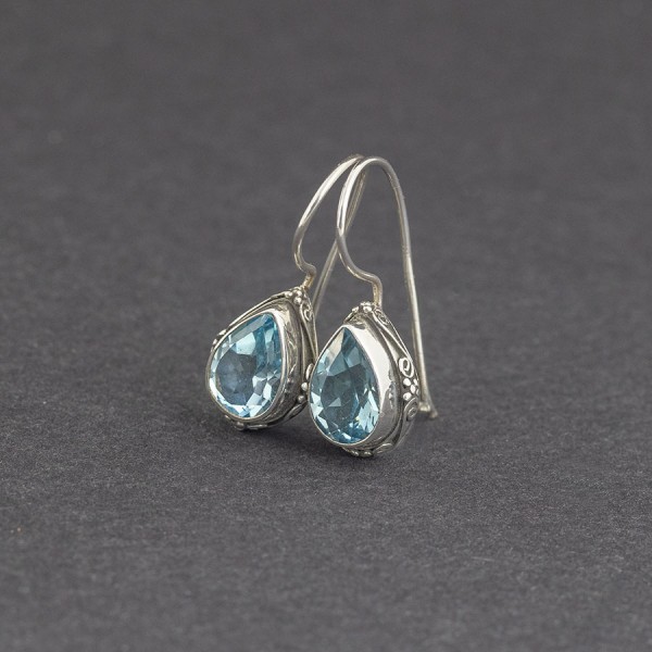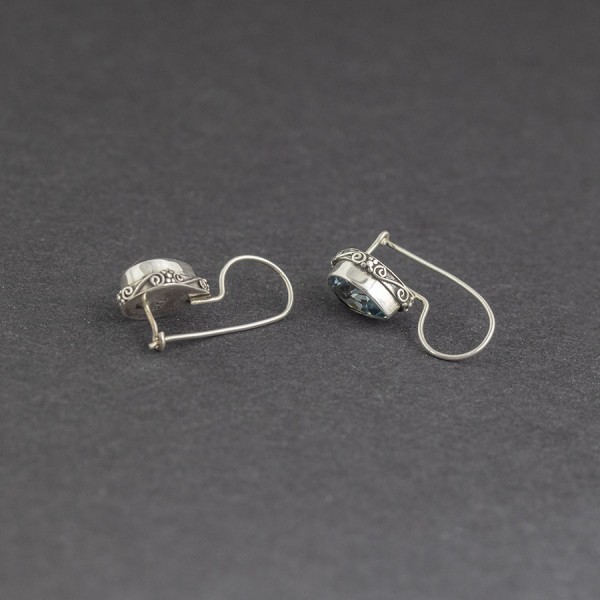 Kolczyki w orientalnym stylu od podstaw wykonane ręcznie ze srebra próby 925 oraz kamieni błękitnego topazu. Wielkość kamieni 7x10 mm. Wielkość tarczy kolczyka 10x13 mm. Bok kolczyka ozdobiony został ręcznie wykonanym ornamentem. Długość całkowita kolczyków 2,6 cm.