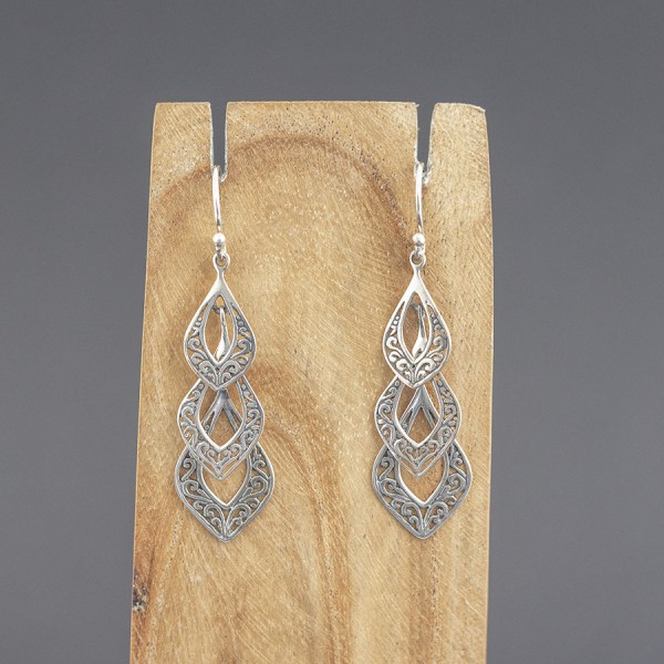 Ażurowe kolczyki wykonane zostały ręcznie ze srebra próby 925. Wielkość ozdobnych elementów 10x16 mm, 12x20 mm, 14x21 mm. Długość całkowita kolczyków 5,3 cm.