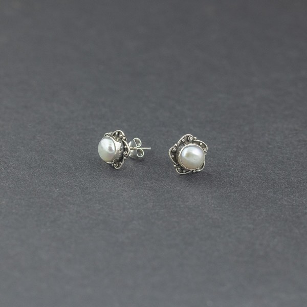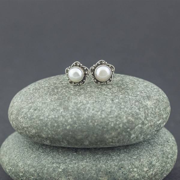 Kolczyki od podstaw wykonane ręcznie ze srebra próby 925 z oprawionym białymi perłami hodowlanymi (6 mm). Wielkość kolczyków 10 mm.