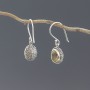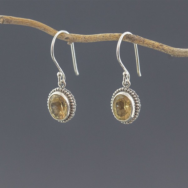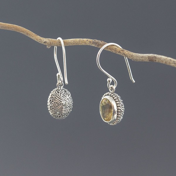 Kolczyki wykonane ze srebra próby 925 z oprawionymi kamieniami cytrynu (7x9 mm). Wielkość tarcz kolczyków 12x10 mm. Długość całkowita kolczyków 2,9 cm. Na uwagę zasługuje ozdobny tył kolczyków.