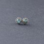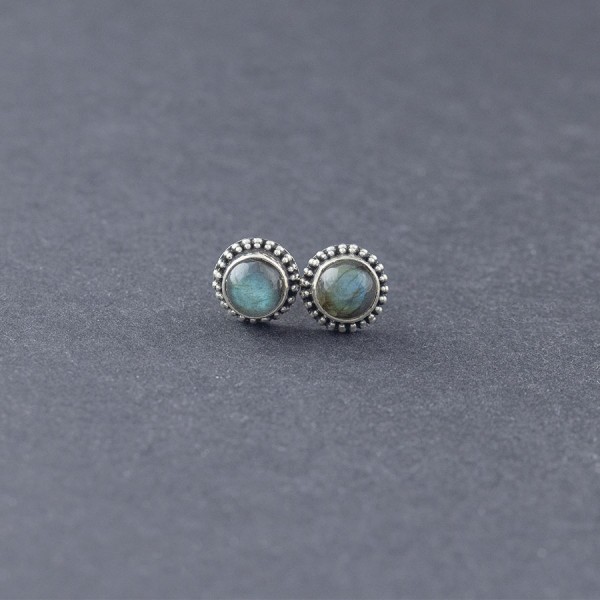 Kolczyki - sztyfty wykonane ze srebra próby 925 z oprawionymi kamieniami labradorytu (7 mm). Wielkość kolczyków 10 mm. Całość zdobień wykonana została ręcznie pracochłonną techniką granulacji.