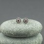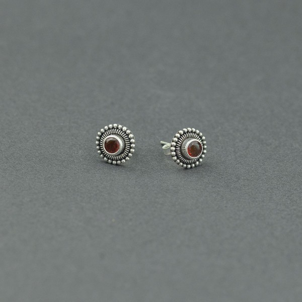 Kolczyki - sztyfty od podstaw wykonane ręcznie ze srebra próby 925 z oprawionymi kamieniami granatu. Całość zdobień wykonana została ręcznie, pracochłonną techniką granulacji. Wielkość kamieni 4 mm. Wielkość kolczyków 9 mm.