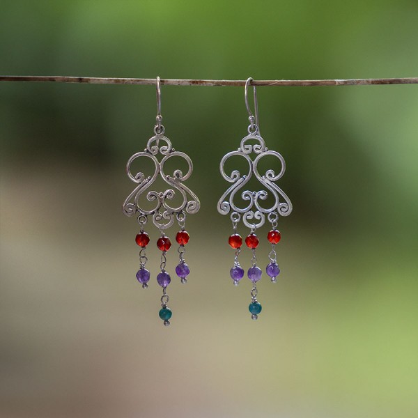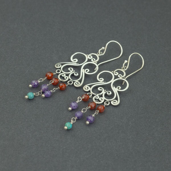Kolczyki w stylu orientalnym od podstaw wykonane zostały ręcznie ze srebra próby 925. Ażurową tarczę ozdabiają kamienie ametystu, turkusu i karneolu. Wielkość kamieni 4 mm. Wielkość tarczy kolczyka 27x23 mm. Długość całkowita kolczyków 7,2 cm.