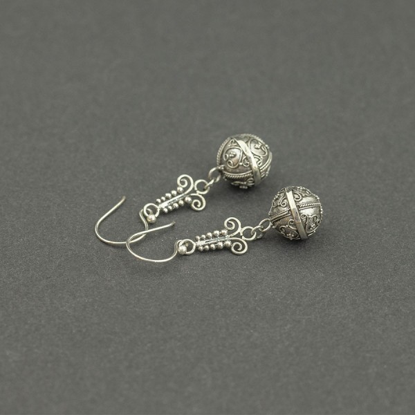 Kolczyki od podstaw wykonane ręcznie ze srebra próby 925. Wielkość ozdobnych kuleczek 10 mm. Długość całkowita kolczyków 4 cm. Całość zdobień wykonana została ręcznie pracochłonną techniką granulacji. Kolczyki stworzone z myślą o Paniach lubiących drobną biżuterię.