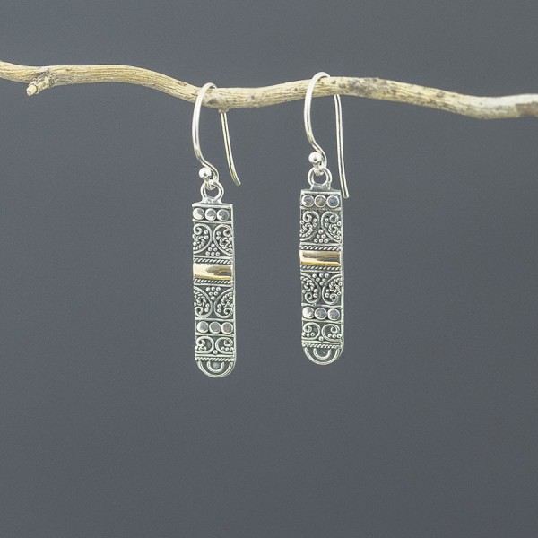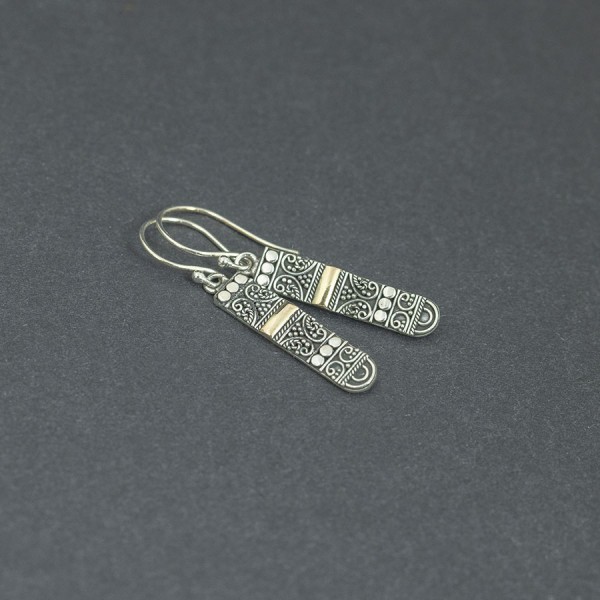 Kolczyki od podstaw wykonane zostały ręcznie ze srebra próby 925 oraz 18-karatowego złota. Wielkość kolczyków 23x5 cm. Długość całkowita kolczyków 3,9 cm. Kolczyki stworzone z myślą o Paniach lubiących drobną biżuterię.