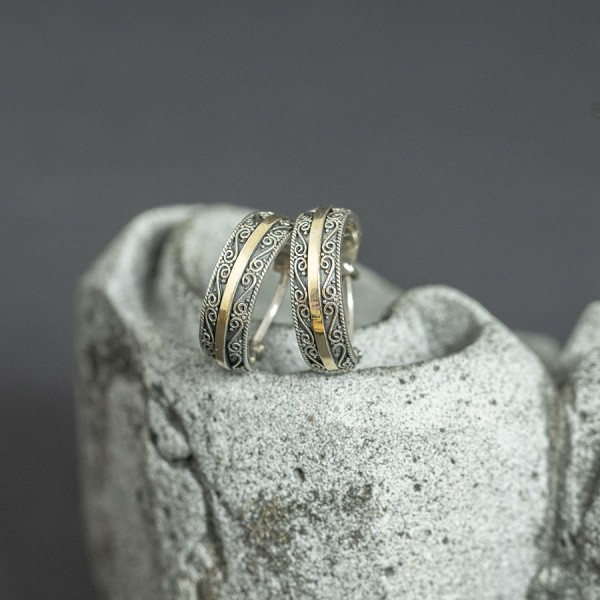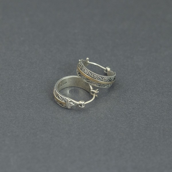 Srebrne, pięknie zdobione kolczyki w całości wykonane ręcznie ze srebra próby 925 oraz 18-karatowego złota. Szerokość obręczy kolczyka 5,2 mm. Długość całkowita kolczyków 1,8 cm. Całość zdobień wykonana została ręcznie pracochłonną techniką granulacji.