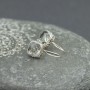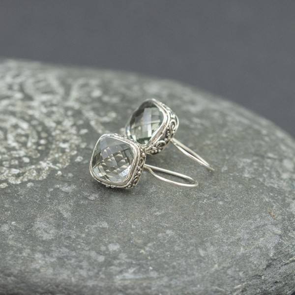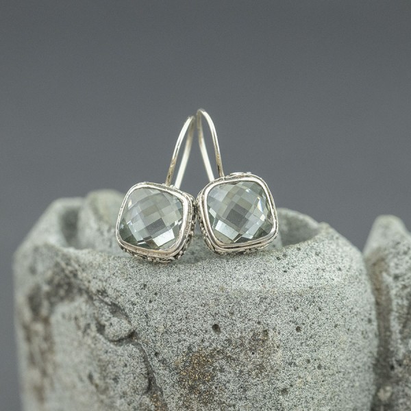 Kolczyki od podstaw wykonane zostały ręcznie ze srebra próby 925 oraz kamieni kwarcu. Bok kolczyków ozdobiony został ręcznie wykonanym ornamentem. Wielkość kamienia 10 mm. Długość całkowita kolczyków 2,5 cm. Do kompletu polecam wisiorek 16586.
