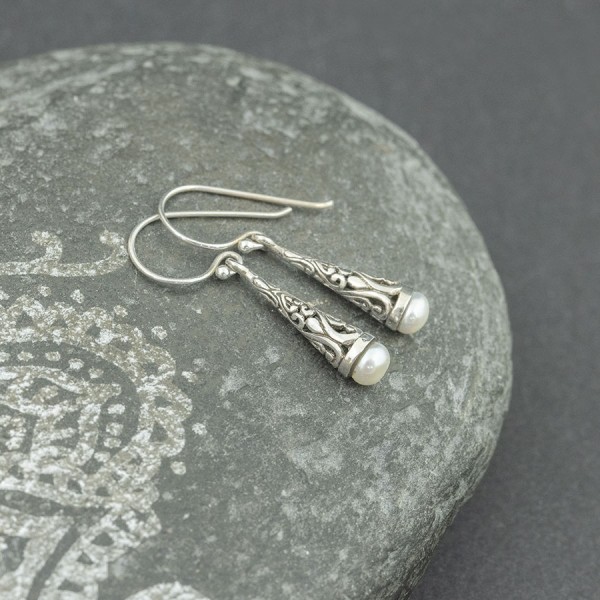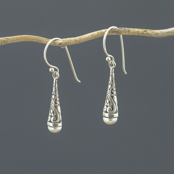 Drobne kolczyki w orientalnym stylu od podstaw wykonane zostały ręcznie ze srebra próby 925 oraz białych perełek słodkowodnych. Wielkość elementu z oprawioną perełka 5x20 mm. Długość całkowita kolczyków 3,3 cm. Kolczyki stworzone z myślą o Paniach lubiących drobną biżuterię.