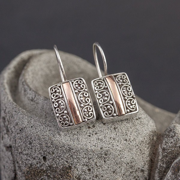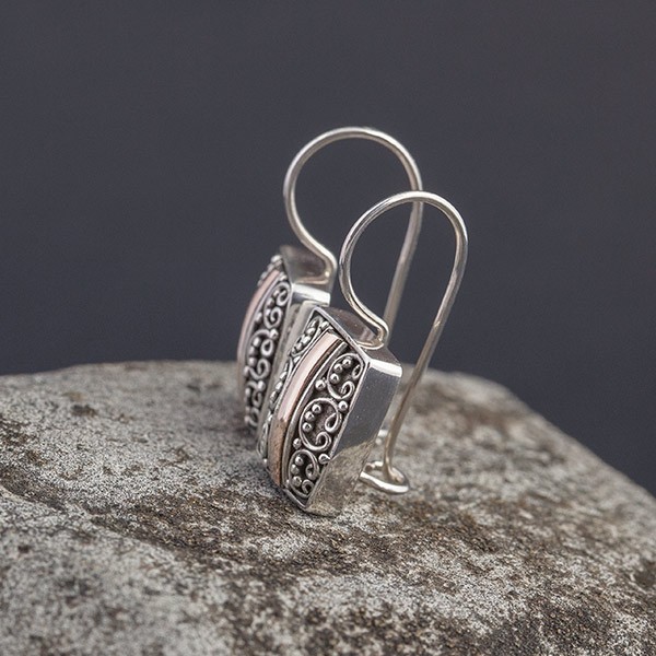 Kolczyki wykonane ze srebra próby 925 oraz 18-karatowego złota. Wielkość tarcz kolczyków 12x10,5 mm. Długość całkowita kolczyków 2,5 cm. Kolczyki są z tyłu zapinane. Całość zdobień wykonana została ręcznie pracochłonną techniką granulacji.