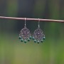 Kolczyki w orientalnym stylu od podstaw wykonane zostały ręcznie ze srebra próby 925 oraz kamieni malachitu. Wielkość. Kamieni 4 mm. Wielkość ozdobnej tarczy kolczyka 18 mm. Długość całkowita kolczyków 4,7 cm.