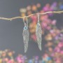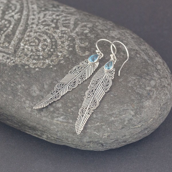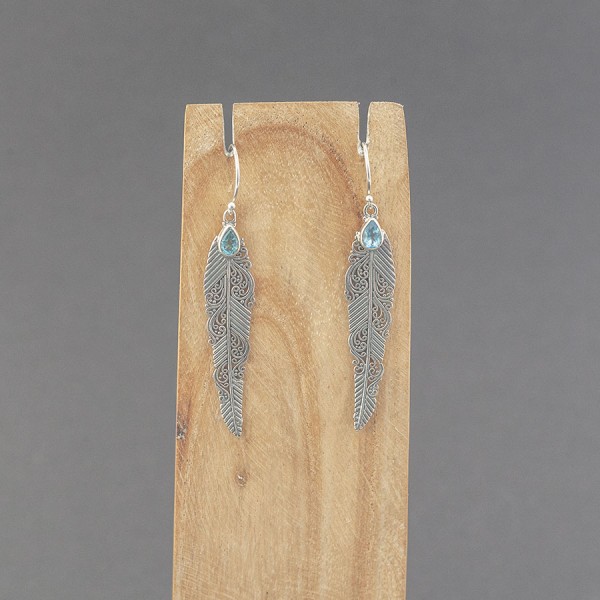 Wyjątkowe kolczyki od podstaw wykonane ręcznie ze srebra próby 925 oraz topazu. Wielkość kamieni 6x4 mm. Wielkość pióra 45x10,5 mm. Długość całkowita kolczyków 6,1 cm.