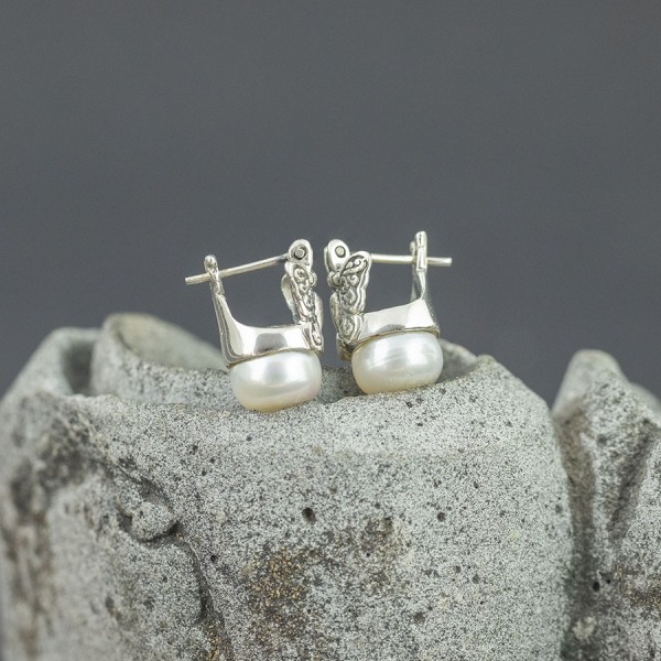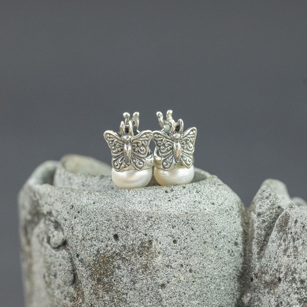 Białe perły słodkowodne ubrane w srebro próby 925. Srebrna "korona" ozdobiona została srebrnym motylkiem. Wielkość perełek 6x9 mm. Długość kolczyków 1,7 cm.