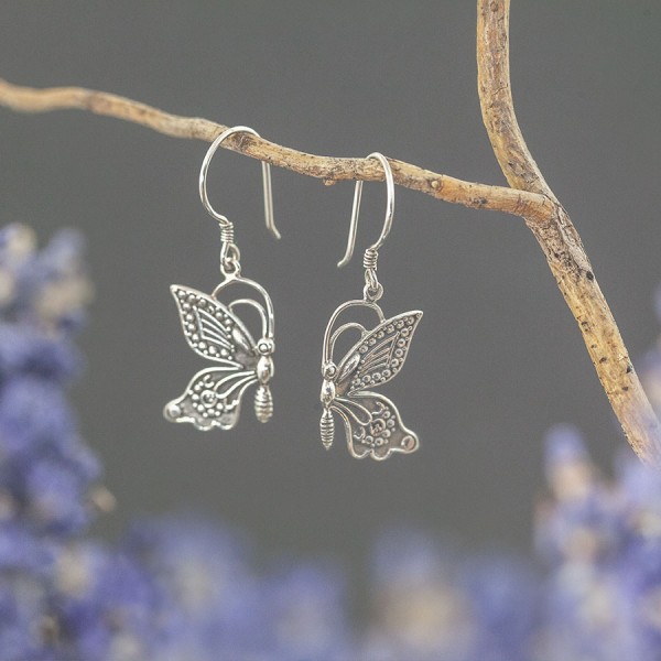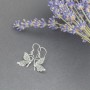 Kolczyki z motywem motyli, od podstaw wykonane ręcznie ze srebra próby 925. Wielkość motylków 20x13 mm. Długość całkowita kolczyków 4 cm.