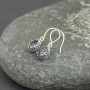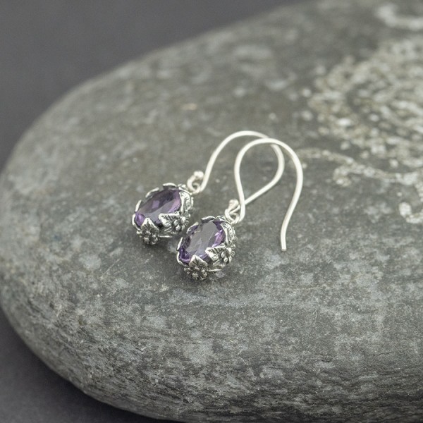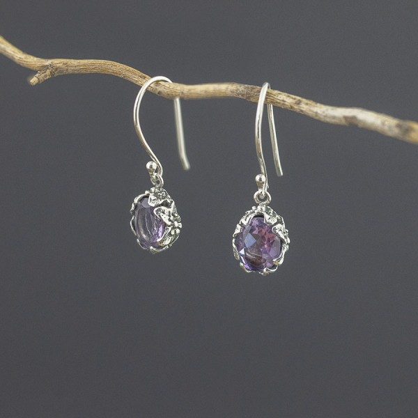 Kolczyki wykonane ze srebra próby 925 z oprawionymi kamieniami ametystu (7x10 mm). Wielkość tarcz kolczyków 9x11 mm. Długość całkowita kolczyków 3,1 cm. Bok kolczyków ozdobiony został ręcznie wykonanym ornamentem z motywem roślinnym.