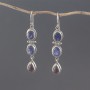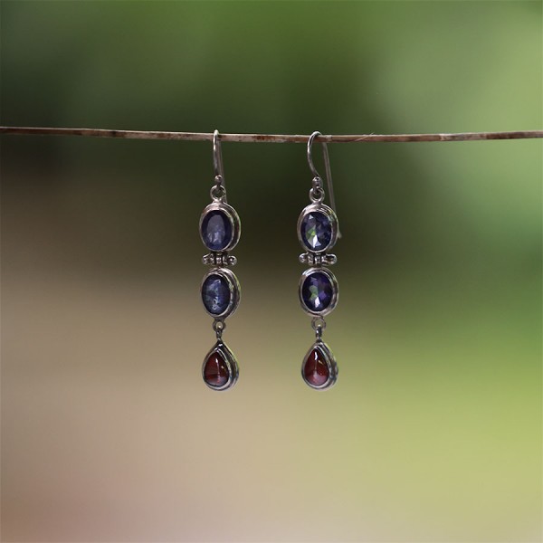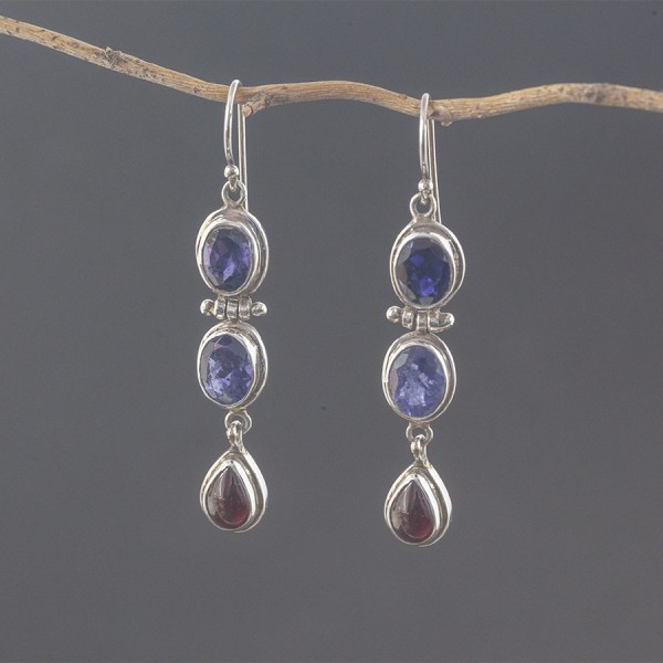 Eleganckie kolczyki od podstaw wykonane zostały ręcznie ze srebra próby 925 z oprawionymi kamieniami iolitu (7x9 mm) i granatu (6x9 mm). Długość całkowita kolczyków 5,8 cm.