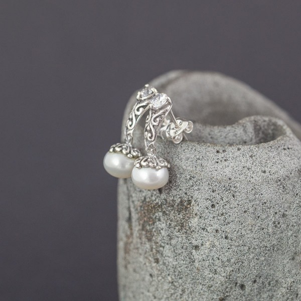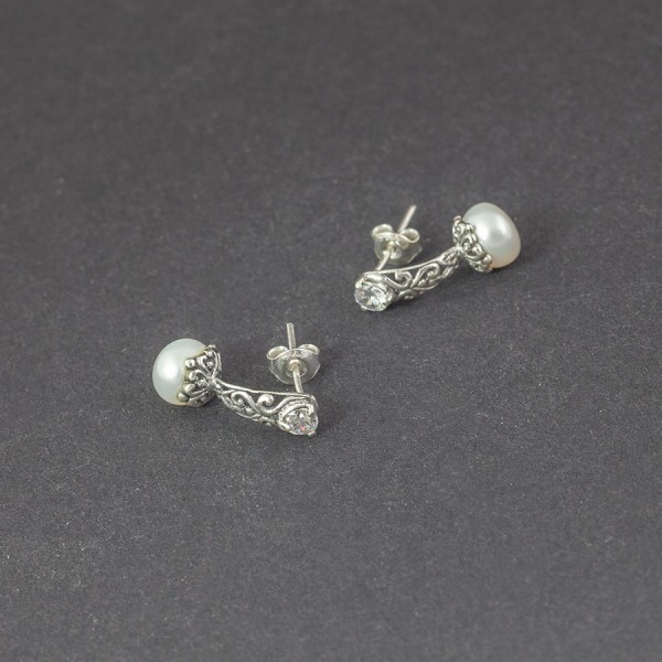 Białe perełki słodkowodne ubrane w srebro próby 925. Górę kolczyka ozdabia cyrkonia, która mieniąc się wspaniale podkreśla charakter pereł. Wielkość perełek 5x8 mm. Długość kolczyków 2 cm. Sztyft znajduje się w górnej części kolczyka.