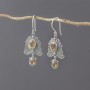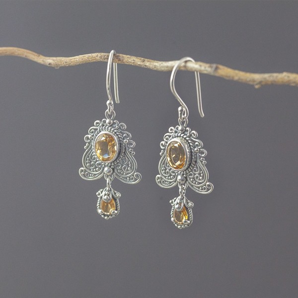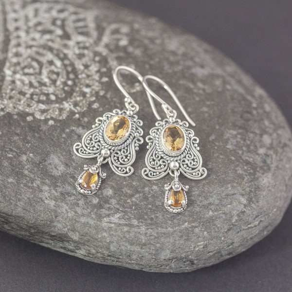 Eleganckie kolczyki w orientalnym stylu od podstaw wykonane zostały ręcznie ze srebra próby 925 oraz kamieni cytrynu. Wielkość kamieni 6x8 mm i 6x4 mm. Długość całkowita kolczyków 4,5 cm.