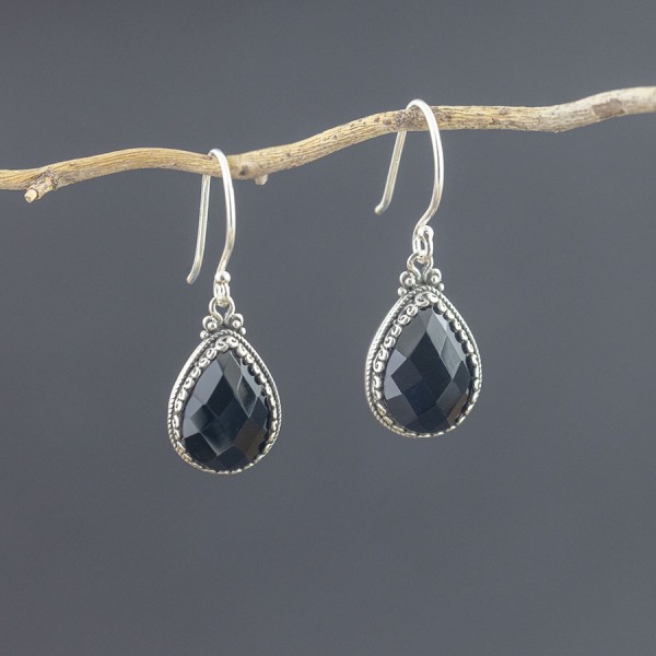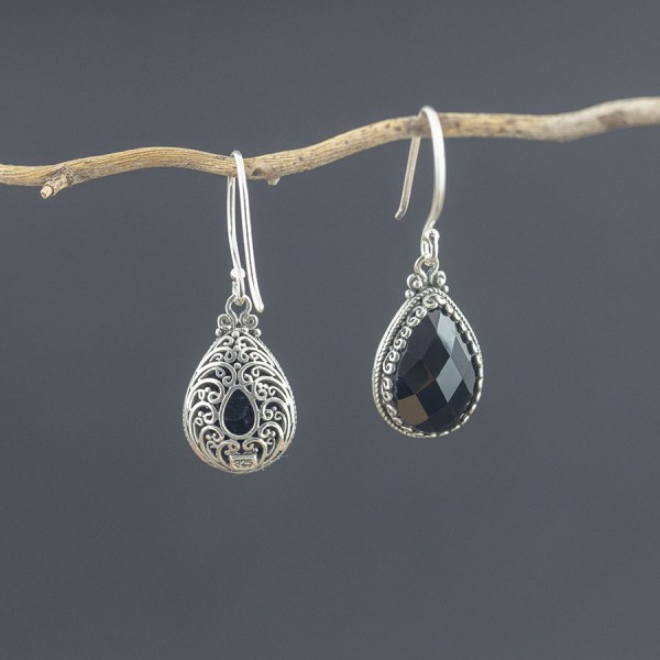 Niezwykłej urody kolczyki od podstaw wykonane ręcznie ze srebra próby 925 z oprawionym kamieniem onyksu. Kamienie ubrane zostały w ręcznie zdobione, ażurowe srebro. Wielkość kamienia 10x14 mm. Wielkość tarczy kolczyka 12x16 mm. Długość całkowita kolczyków 3,5 cm.