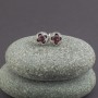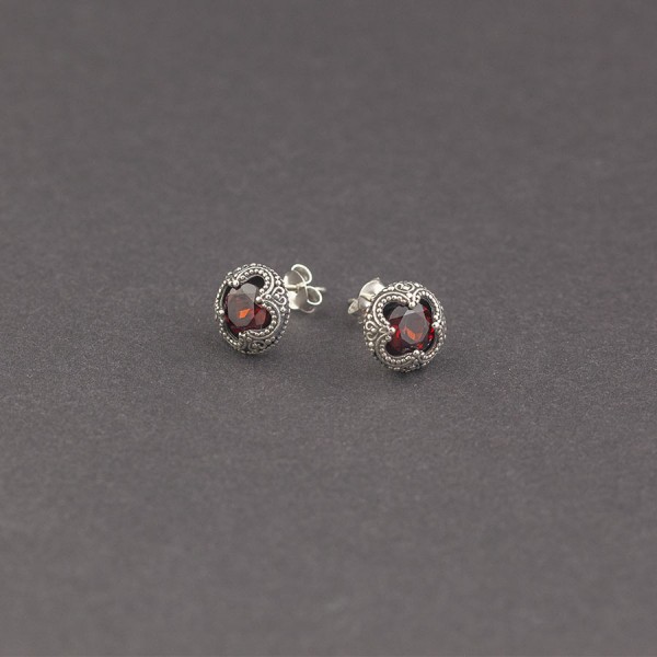 Eleganckie kolczyki sztyfty w stylu orientalnym. Wykonane od podstaw ręcznie ze srebra próby 925 oraz kamieni granatu (6 mm). Wielkość kolczyków 10 mm. Całość zdobień wykonana została ręcznie pracochłonną techniką granulacji.