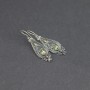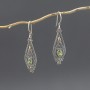 Kolczyki wykonane ze srebra próby 925 oraz złota 18K z oprawionymi kamieniami peridotu (6x4 mm). Wielkość tarczy kolczyka 33x13 mm. Całość zdobień wykonana została ręcznie pracochłonną techniką granulacji. Długość całkowita kolczyków 5 cm.