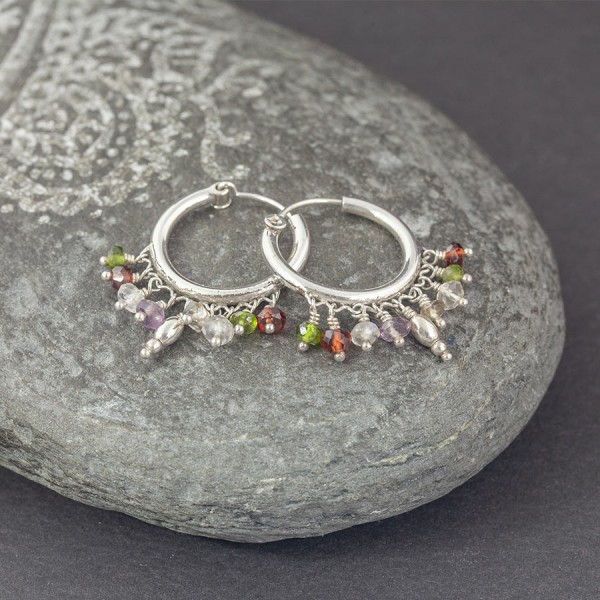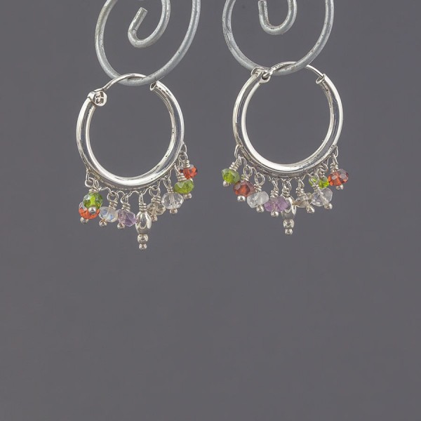 Kolczyki koła od podstaw wykonane ręcznie ze srebra próby 925 oraz kamieni granatu, peridotu, ametystu, kamieni księżycowych. Wielkość kół 21,5 mm. Długość całkowita kolczyków 3,2 cm.