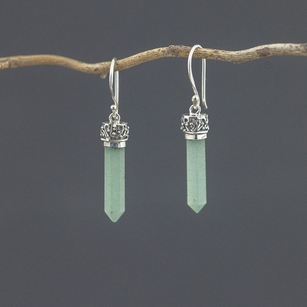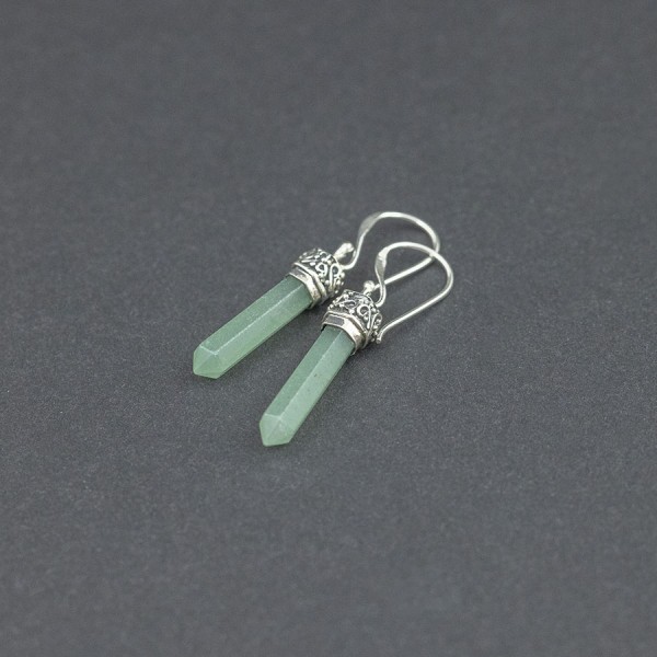 Kamienie awenturynu ubrane w ręcznie zdobione srebro próby 925. Wielkość wystającego kamienia 18x4,5 mm. Długość całkowita kolczyków 3,9 cm.