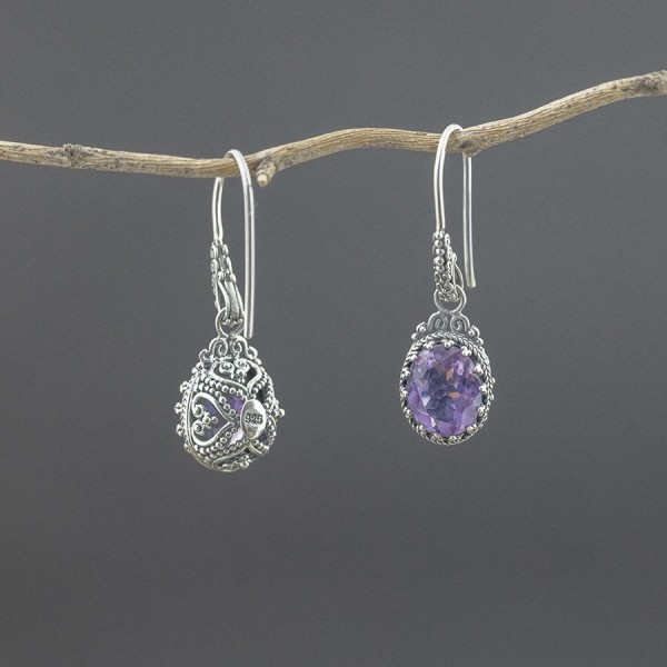 Eleganckie kolczyki, których podstawę stanowią kamienie ametystu (11x8 mm) oprawione w srebro próby 925. Kolczyki ozdobione są ręcznie wykonanym ornamentem. Bigle również zostały wykonane i ozdobione ręcznie. Wielkość tarczy kolczyka 15x10 mm. Długość całkowita kolczyków 3,5 cm.