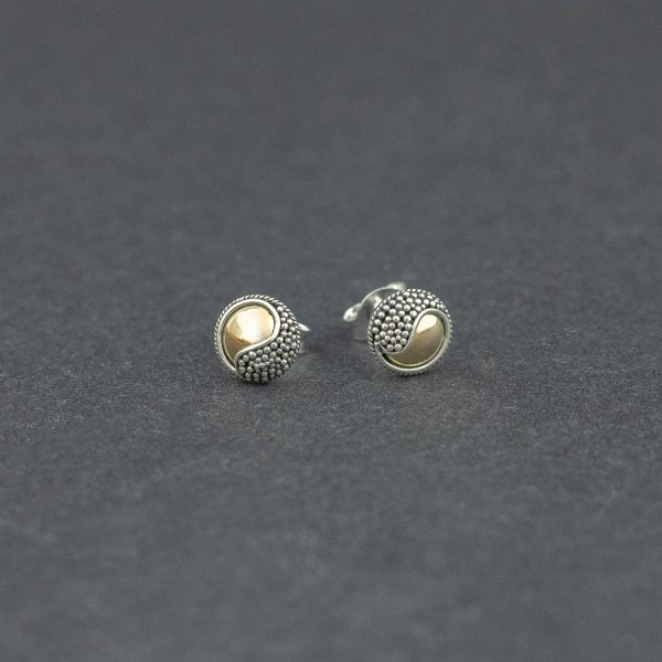 Kolczyki - sztyfty wykonane od postaw ręcznie ze srebra próby 925 oraz 18-karatowego złota. Wielkość kolczyków 7 mm.