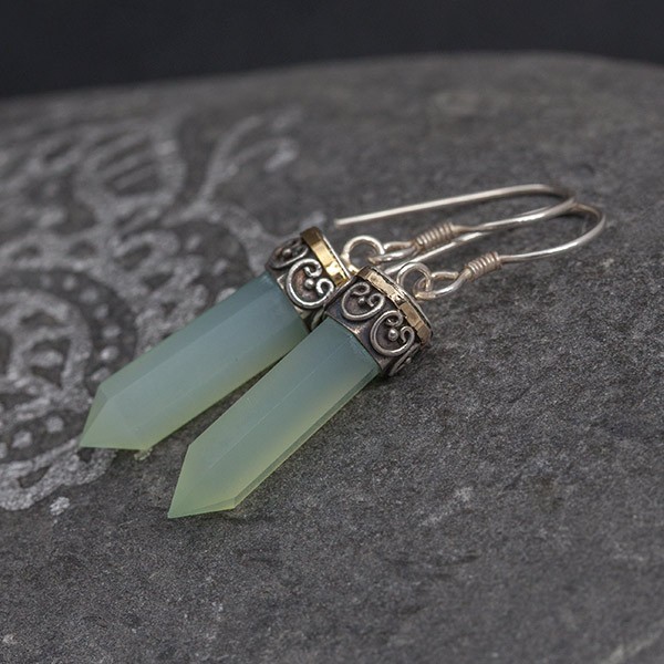 Chalcedon oprawiony w srebro próby 925. Dodatkową ozdobę kolczyków stanowi pozłacany paseczek ukryty pomiędzy balijskimi ornamentami. Wielkość wystającego kamienia 6x18 mm. Długość całkowita kolczyków 4,3 cm. Biżuteria zostanie ozdobnie zapakowana.