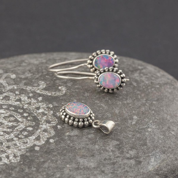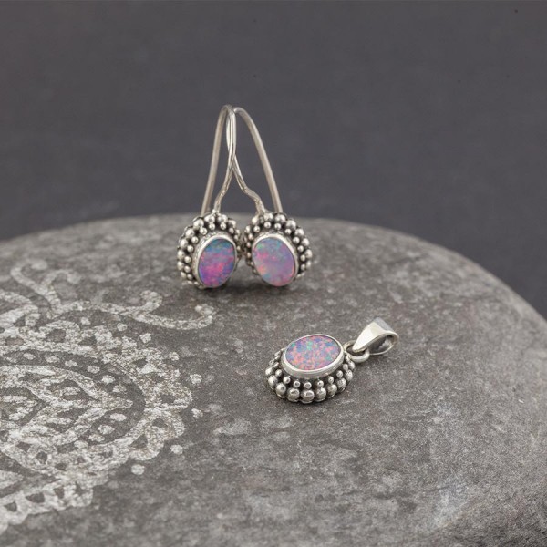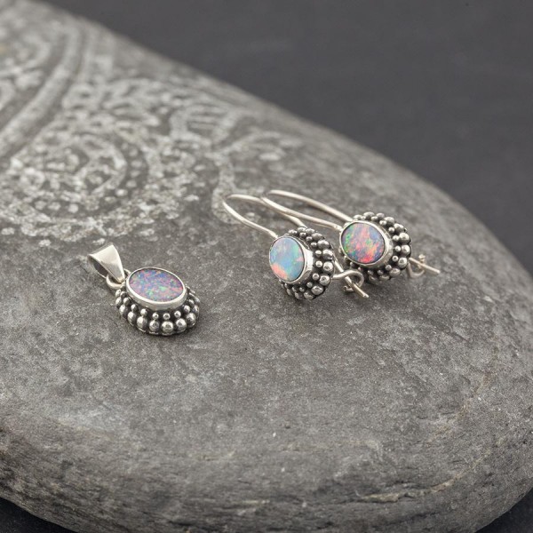 Kolczyki, których podstawę stanowi kamień opalu australijskiego (7x5 mm) oprawiony w srebro próby 925. Kolczyki z boku ozdobione są ręcznie wykonanym ornamentem. Wielkość tarczy kolczyka 9x11 mm. Kolczyki są z tyłu zapinane. Długość kolczyków 2,5 cm. Wielkość opalu w wisiorku 6x8 mm. Wielkość tarczy wisiorka 9,5x11,5 mm. Długość całkowita wisiorka 2 cm.