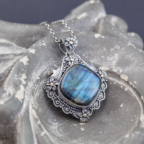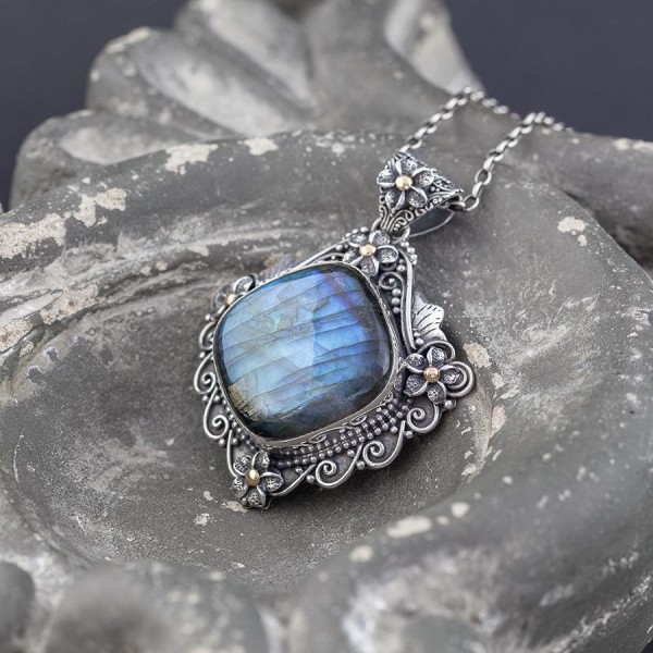 Okazały, bogato zdobiony wisior od podstaw wykonany ręcznie ze srebra próby 925 z oprawionym kamieniem labradorytu. Wielkość kamienia 27 mm. Całość zdobień wykonana została ręcznie. Środki kwiatków uszlachetnione zostały 18-karatowym złotem. Wielkość tarczy wisiora 44x44 mm.