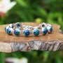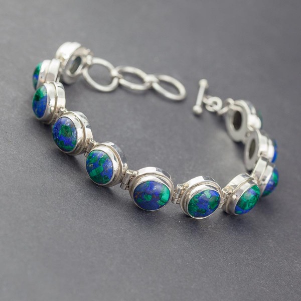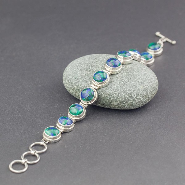 Niezwykłej urody azuryt ubrany w srebro próby 925. Całość wykonana ręcznie. Wielkość kamienia 10 mm. Wielkość pojedynczego ogniwa bransoletki 12,5 mm. Długość całkowita bransolety 21 cm. Bransoletka posiada trzy kółeczka pozwalające zapiąć ją na długości 19 cm, 20 cm lub 21 cm.