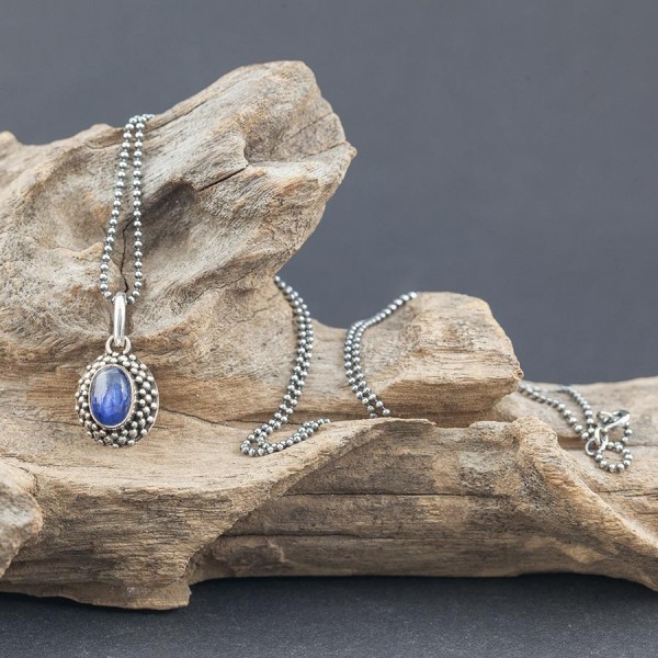Kamień kyanitu ubrany w srebro próby 925. Całość zdobień wykonana ręcznie. Wielkość kamienia 5x8 mm. Wielkość tarczy wisiorka 13x11 mm. Długość całkowita wisiorka 2,2 cm. Wisiorek zawiesiłam na łańcuszku długości 46,5 cm.