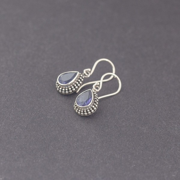 Kolczyki wykonane ze srebra próby 925 z oprawionymi kamieniami iolitu (6x8 mm). Wielkość tarcz kolczyków 9x11 mm. Długość całkowita kolczyków 2,5 cm. Kolczyki od podstaw zostały wykonane ręcznie.