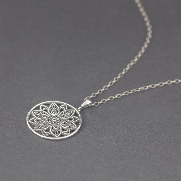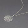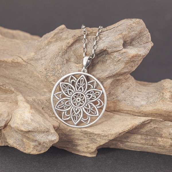 Ażurowy wisiorek w formie mandali od podstaw wykonany ręcznie ze srebra próby 925. Wielkość tarczy wisiorka 30 mm. Długość całkowita wisiorka 4 cm.