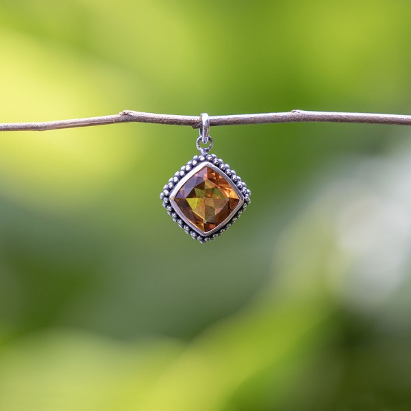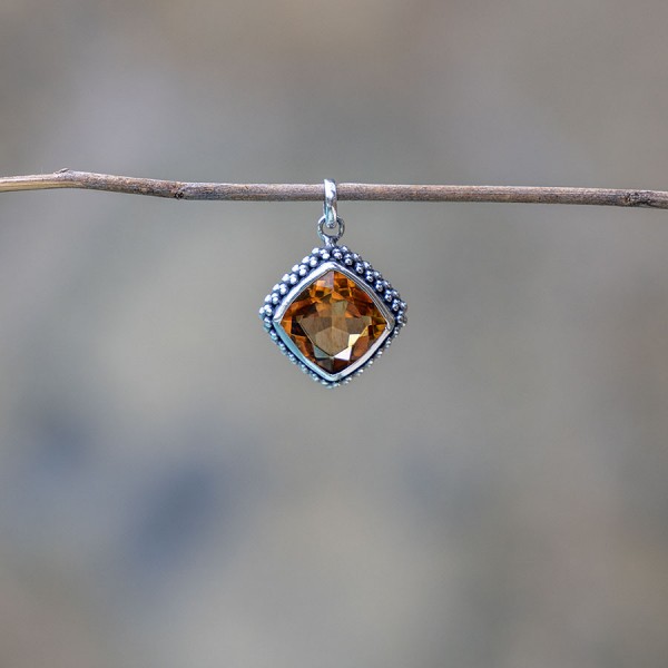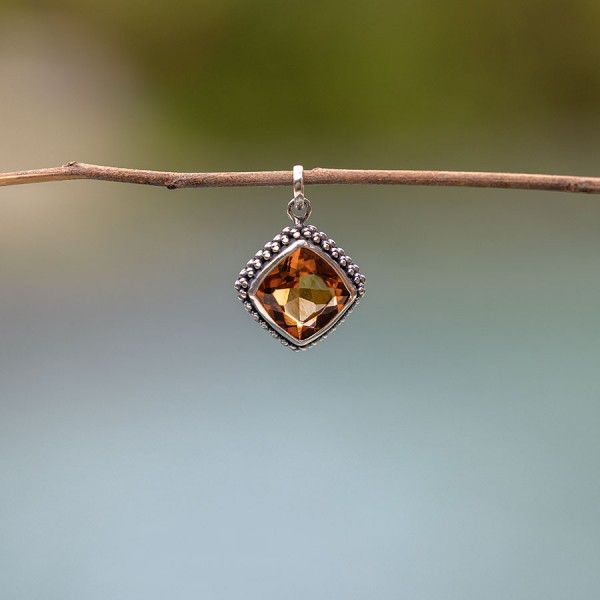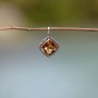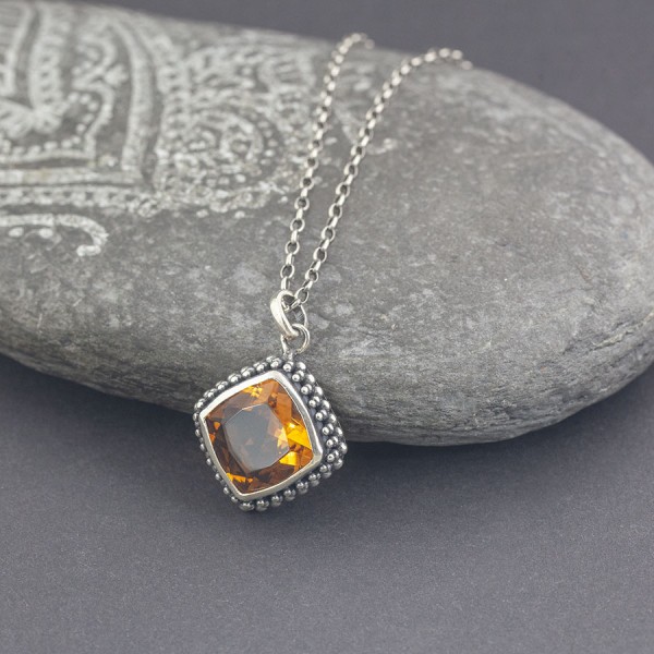 Wisiorek z oprawionym w srebro kamieniem cytrynu (18x18 mm) od podstaw wykonany ręcznie pracochłonną techniką granulacji. Wielkość tarczy wisiorka 24x24 mm. Długość całkowita wisiorka 3,5 cm.