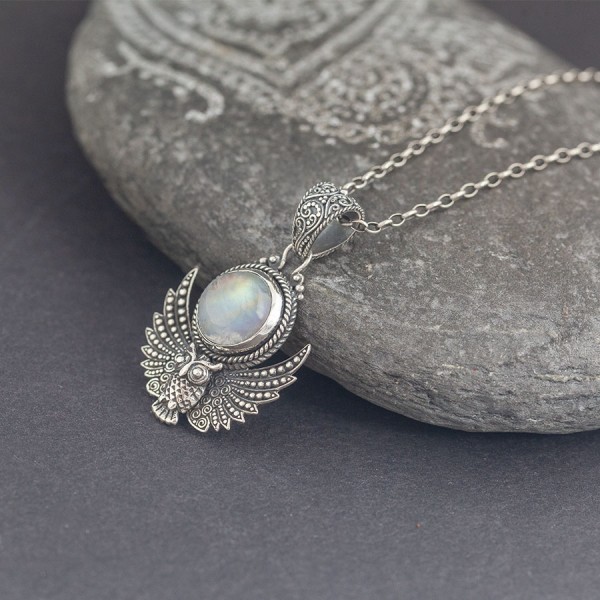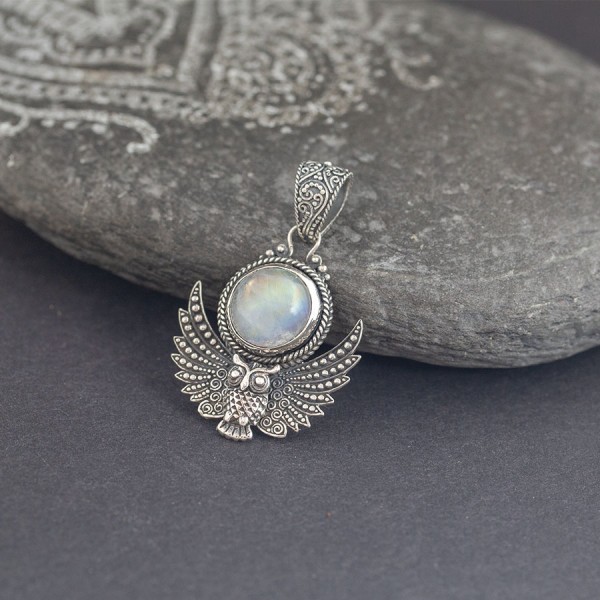 Wisior z motywem sowy od podstaw wykonany ręcznie ze srebra próby 925 z oprawionym kamieniem księżycowym. Wielkość kamienia 13 mm. Długość całkowita wisiorka 4,6 cm. Całość zdobień wykonana została ręcznie pracochłonną techniką granulacji.