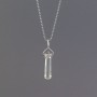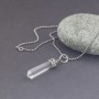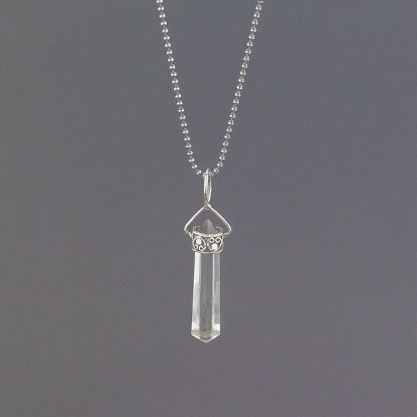 Kryształ górski ubrany w srebro próby 925. Całość zdobień wykonana ręcznie. Wielkość kryształu 35x9 mm. Długość całkowita wisiorka 4,8 cm. Wisiorek zawiesiłam na srebrnym oksydowanym łańcuszku długości 45,5 cm.