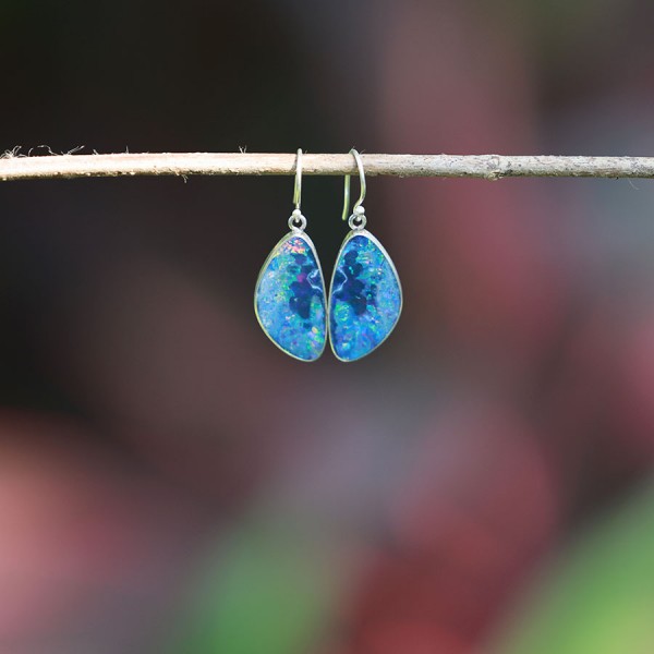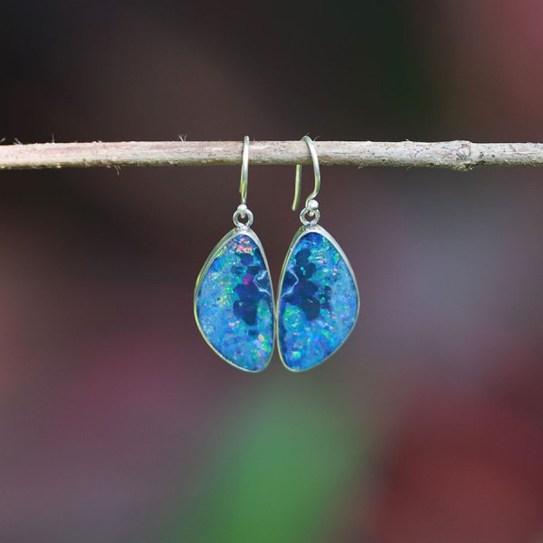 Absolutnie niezwykłe opale australijskie (typu dublet) ubrane w srebro próby 925. Kolczyki od podstaw wykonane ręcznie. Wielkość opalu 23x12 mm. Długość całkowita kolczyków 3,7 cm. Pojedynczy, niepowtarzalny egzemplarz.