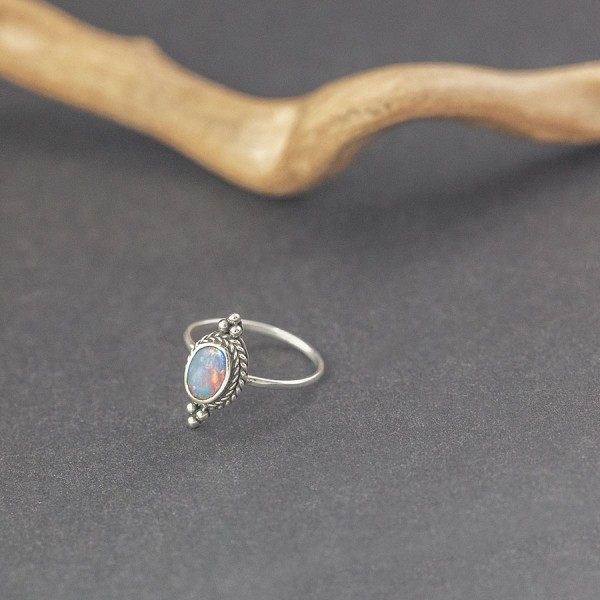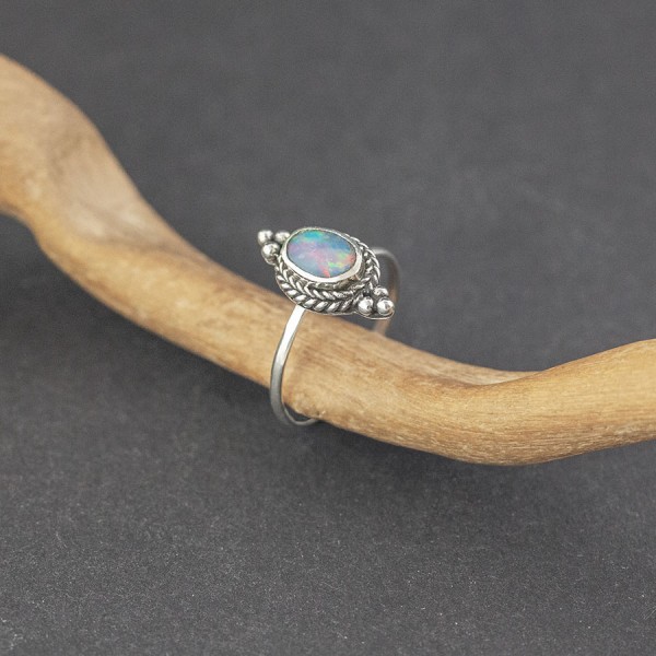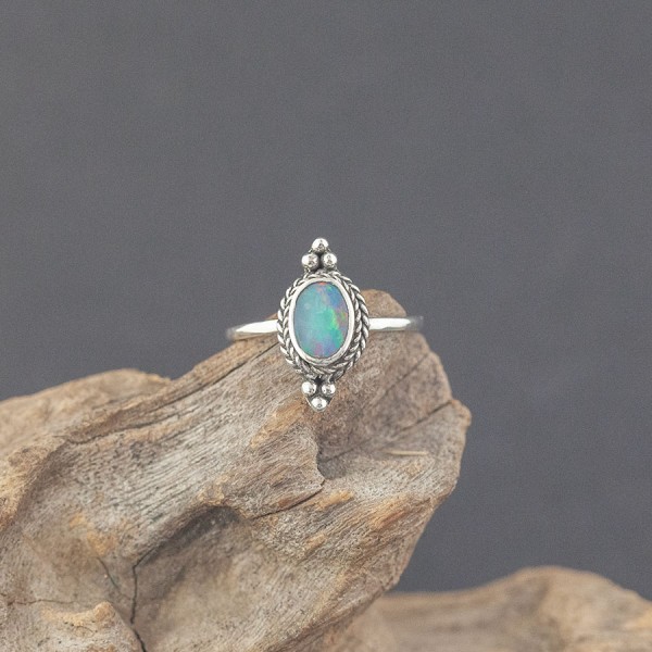 Pierścionek od podstaw wykonany ręcznie ze srebra próby 925 z oprawionym kamieniem opalu australijskiego. Wielkość kamienia 5x7 mm. Wielkość tarczy pierścionka 8x16 mm. Rozmiar jubilerski 13.