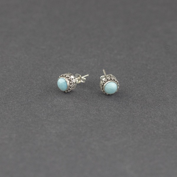 Kolczyki - sztyfty od podstaw wykonane ręcznie ze srebra próby 925 z oprawionymi kamieniami larimaru. Bok kolczyka ozdobiony został ręcznie wykonanym ornamentem. Wielkość kamieni 6 mm. Wielkość kolczyków 8 mm.
