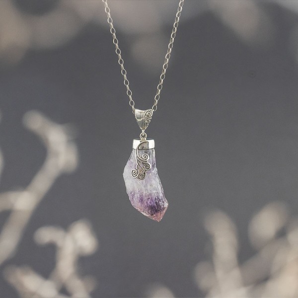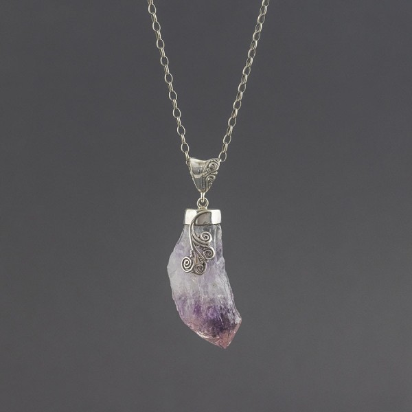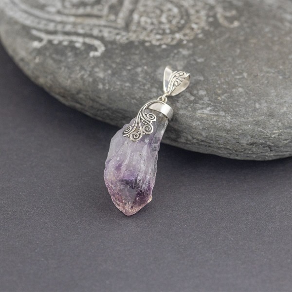 Ametyst ubrany w srebro próby 925. Całość zdobień wykonana ręcznie. Wielkość kamienia 40x16 mm. Długość całkowita wisiorka 5,3 cm.