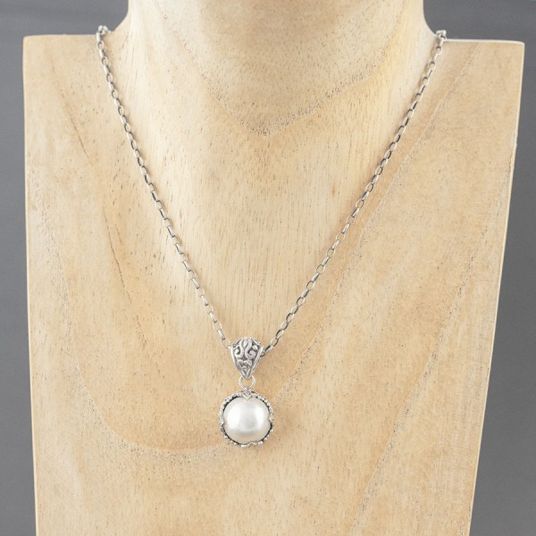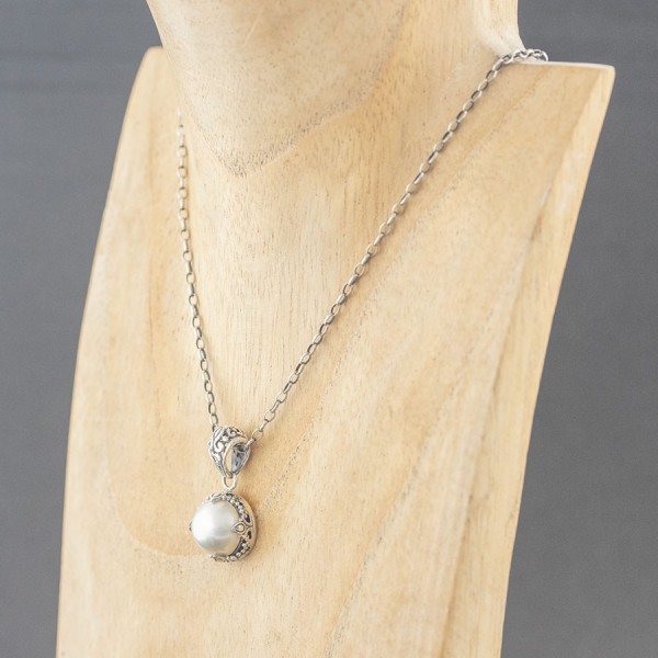 Wisiorek od podstaw wykonany został ręcznie ze srebra próby 925 z oprawiona biała perłą (12 mm). Wielkość tarczy wisiorka 14 mm. Długość całkowita wisiorka 2,8 cm.
