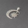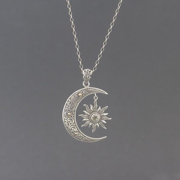 Okazały wisior z motywem księżyca i słońca od podstaw wykonany ręcznie ze srebra próby 925. Wielkość księżyca 9,5x41 mm; wielkość słońca 25 mm. Słońce ozdobione zostało kamieniem zielonego ametystu (5 mm) a księżyc 18-karatowym złotem. Długość całkowita wisiorka 5,3 cm.
